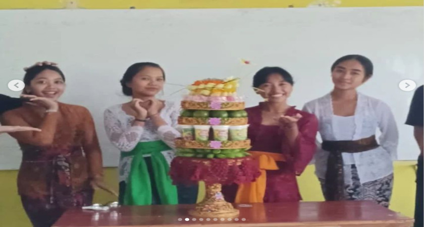 Dengan khidmat, siswa-siswa Hindu berkumpul di aula sekolah, membawa beragam bahan dan perlengkapan untuk membuat Gebogan. Mereka terlihat antusias dan penuh keterampilan dalam menyusun dan menghias tumpeng-tumpeng beraneka warna dengan bunga dan dedaunan segar.