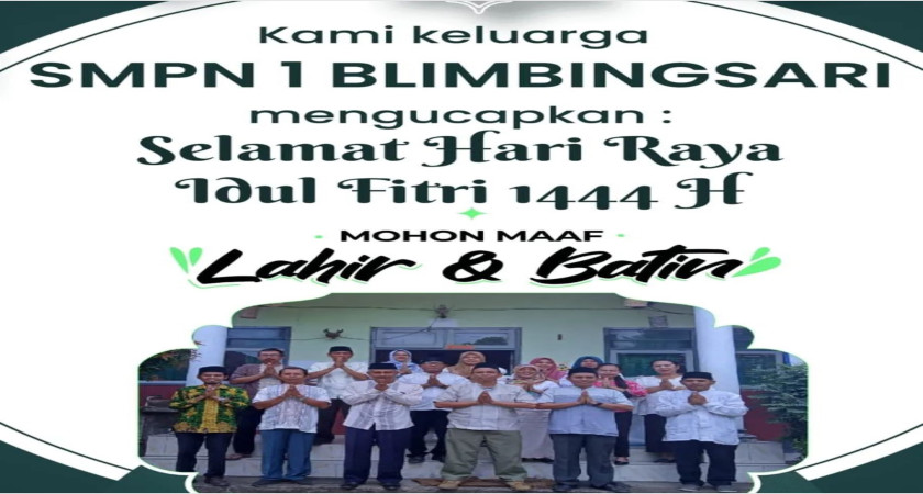 Di momen yang penuh kehangatan dan kegembiraan, foto ini menampilkan Guru SMPN 1 Blimbingsari dengan penuh sukacita mengucapkan SELAMAT HARI RAYA IDUL FITRI 1444 H kepada seluruh siswa, rekan kerja, dan masyarakat sekolah.